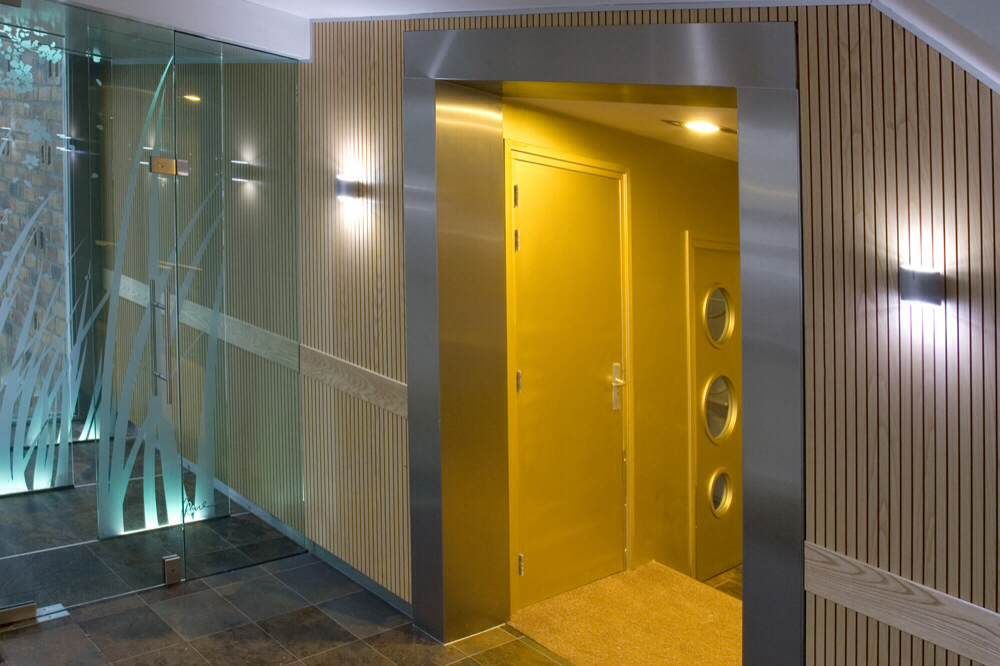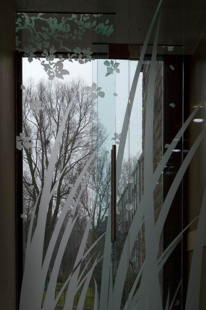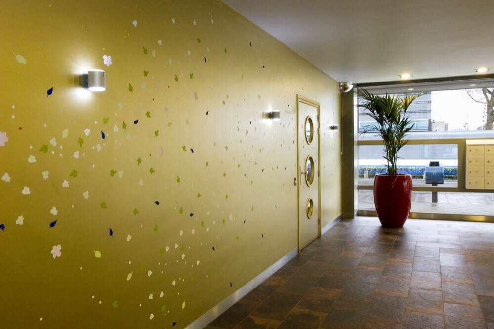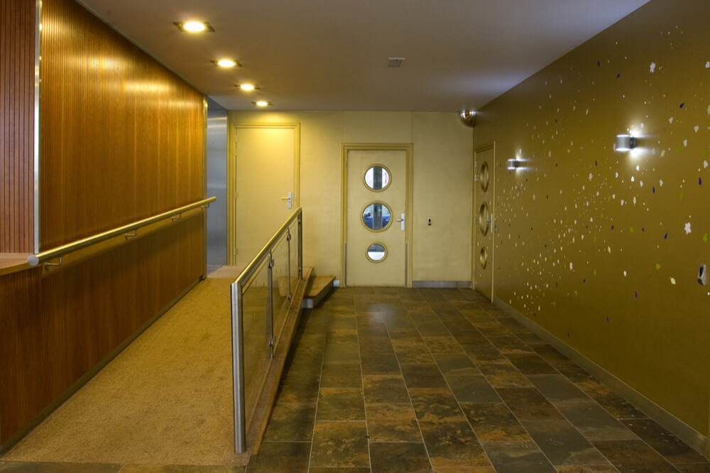 Arton alle minpunten in plus veranderd. Zo hebben we bijvoorbeeld de deuren naar de bergingen die zo prominent in het zicht waren, tot stijlelementen gemaakt door ze te vervangen door speciaal ontworpen deuren. We hebben gekozen voor geluiddempende en brandvertragende houten platen om de liftschachten rondom mee te bekleden. De vloerplaten zijn kleurig en toch ingehouden als Russische leisteen. In het lifthalletje is de loze ruimte die zicht geeft naar buiten, opgevuld met een glas kunstwerk, van onder en boven aangelicht met LED.