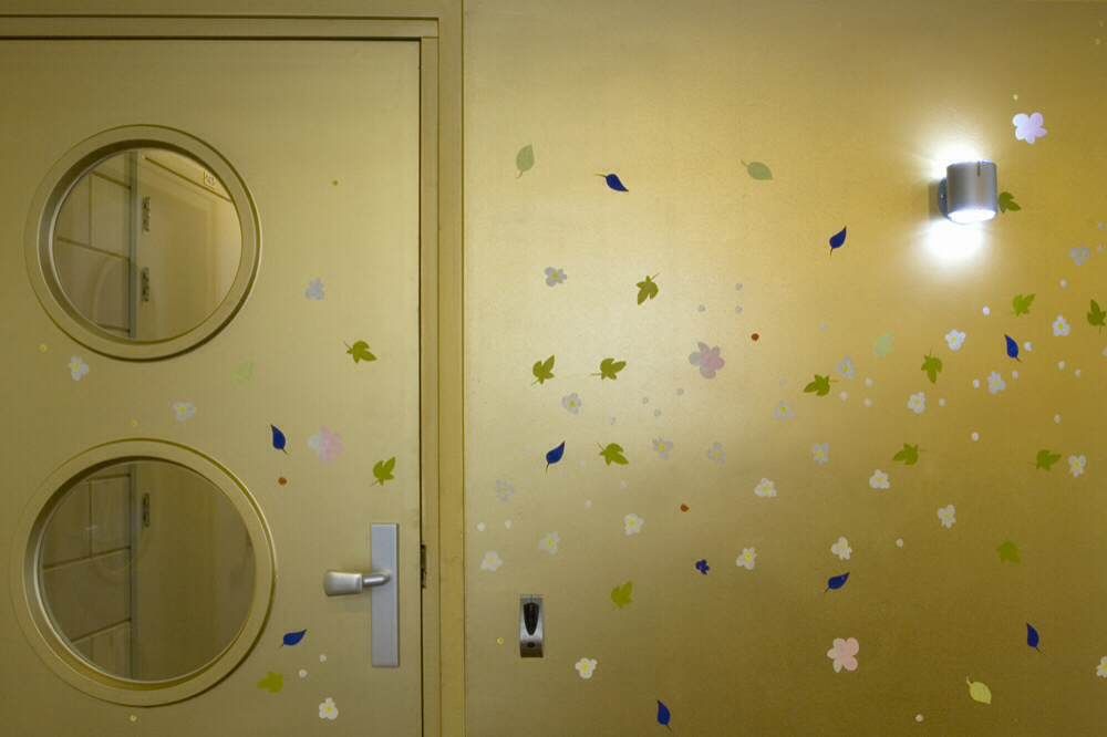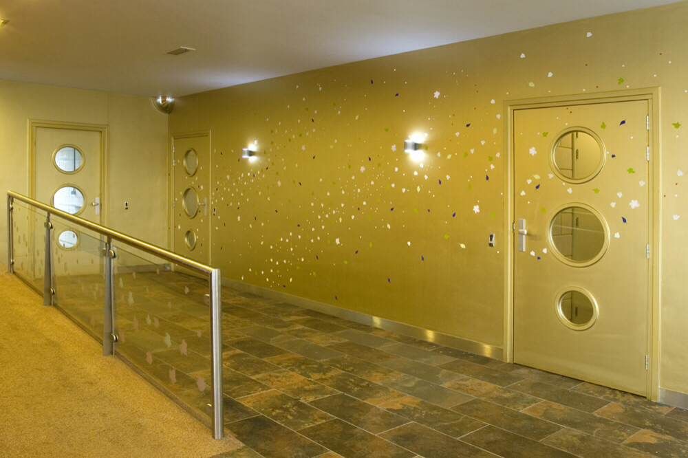 Vanwege de lange gang werd het beeldend uitgangspunt een lentebriesje , dwarrelende blaadjes op een gouden achtergrond.