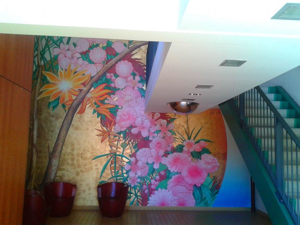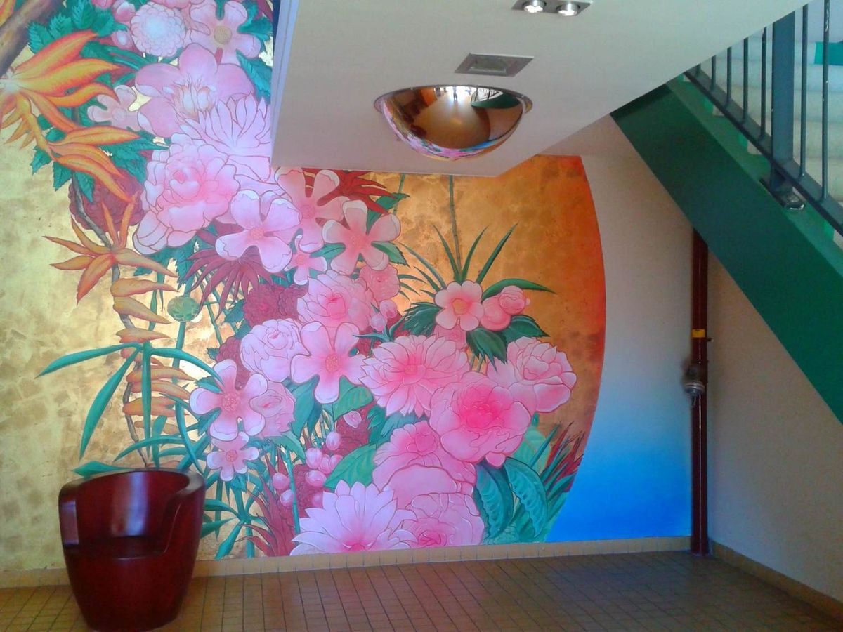 Door de hol klinkende binnenruimte was behoefte aan veel geluiddempend materiaal. Gekozen is om de liftschachten rondom te bekleden met geluiddempende en brandwerende houtplaten. Om de ver naar achteren gesitueerde achterwand van 8m x 5m toch duidelijk in het zicht te houden, is gekozen voor een bloemen schildering op een grote halve cirkel van semi bladgoud. Deze schildering is door