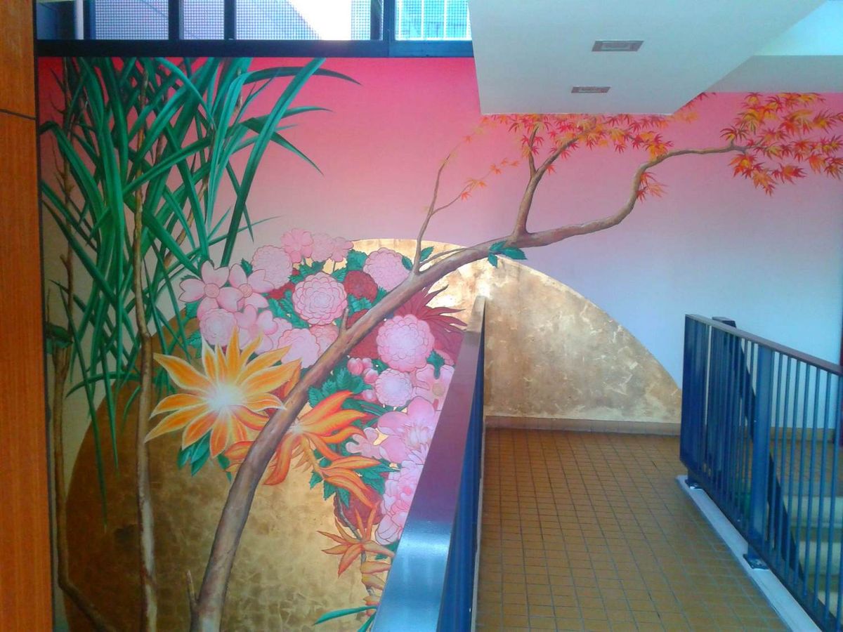 De vraag van de woningbouwvereniging was om de te grote en hol klinkende entreehal van de Osdorppleinflat een nieuwe allure te geven en gezelliger te maken. Liefst met behoud van de originele gele tegelvloer. Uitgangspunt is geworden de rust én uitbundigheid van tuin. Het kleurverloop is geïnspireerd en toegepast als in een Japanse houtsnede.